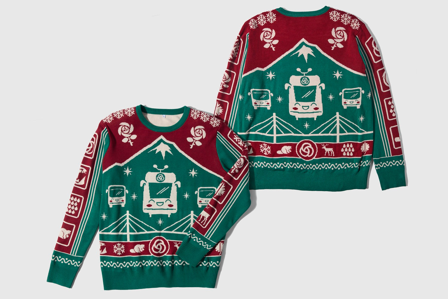 This limited edition TriMet Holiday Sweater features a cheerful transit-themed holiday design in green, burgundy, and cream. This sweater is made of 100% acrylic knit fabric and is very soft.